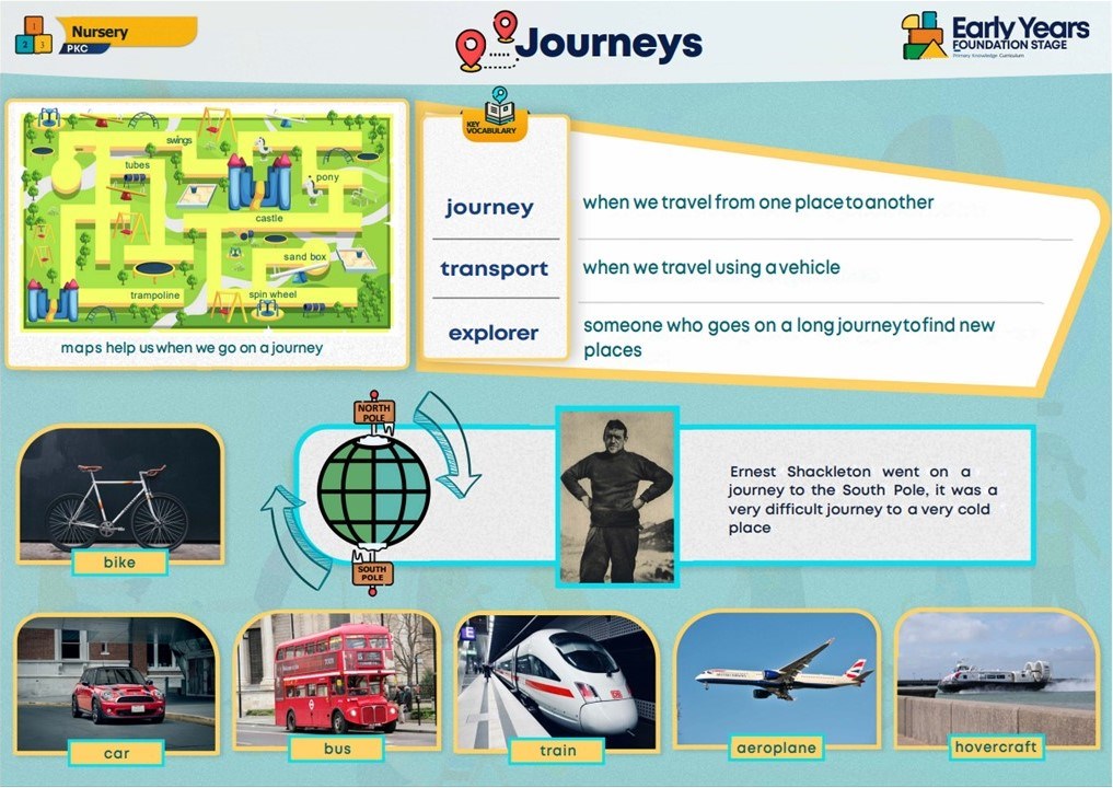 Any discussions that you can have at home with your children about visits, trips, outings or journeys they have been on will be beneficial for their learning in Nursery. Discussing or looking at modes of transport and how you travel to different places and why you go on a journey to that place will also be very helpful!