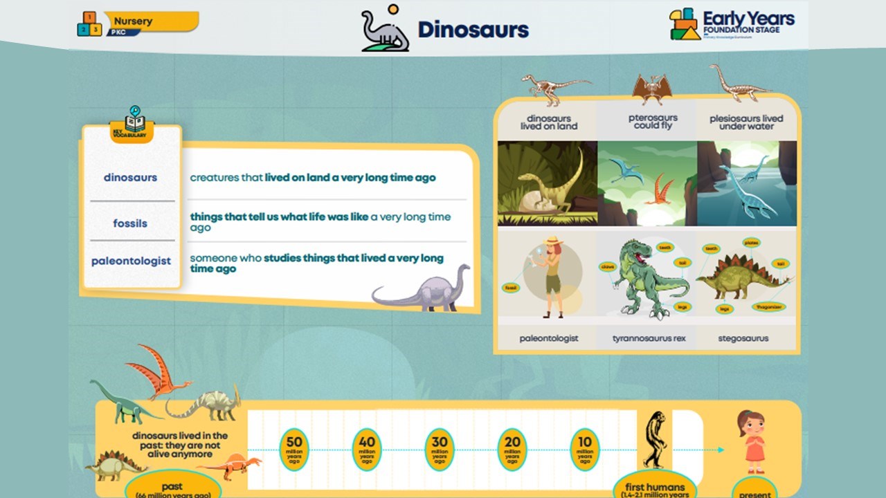 The children will learn about two specific dinosaurs: the very familiar Tyrannosaurus Rex and the Stegosaurus. These two dinosaurs lived many years apart, and would never have met. In fact, on a timeline, a Tyrannosaurus Rex would be nearer the invention of the iPad than Stegosaurus! The two dinosaurs are helpful for young children to compare and contrast; they can look at things like how they walked, what they looked like, what they ate.